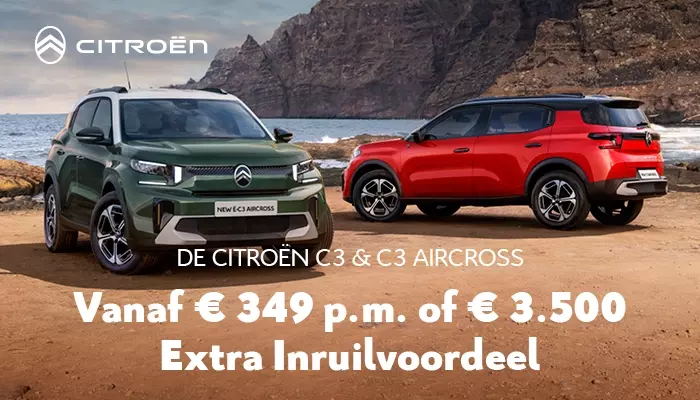 Rijden in een nieuwe Citroën C3 of C3 Aircross is nu extra aantrekkelijk. U stapt al in voor een scherp private lease tarief van slechts € 349,- per maand, en dat zonder verrassingen achteraf. Liever kopen? Dan profiteert u tijdelijk van een extra hoge inruilpremie tot wel € 3.500,-. Wat u ook kiest: dit is hét moment om over te stappen. Slim rijden begint hier.