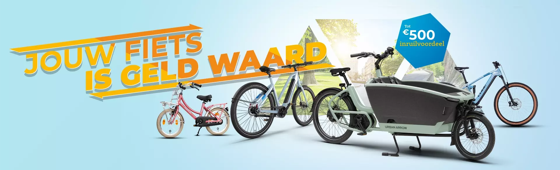 Lever je huidige fiets in en pak tot € 500 éxtra voordeel bij aankoop van een nieuwe, bovenop wat je fiets al waard is. Zo word de overstap naar een nieuwe e-bike, sportfiets of stadsfiets wel heel aantrekkelijk!
