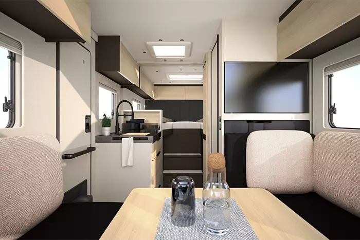 Wat deze Bürstner bijzonder maakt, zijn de verstelbare en verschuifbare meubeldelen. Zo maak je van de zithoek in een handomdraai een loungeplek. Ook in de badkamer is slim nagedacht: de wand kun je verschuiven, zodat je meer ruimte hebt bij het douchen of juist bij het toilet. Daarnaast is het interieur strak vormgegeven, met veel opbergruimte en een modern panoramadak dat zorgt voor licht en een ruimtelijk gevoel.