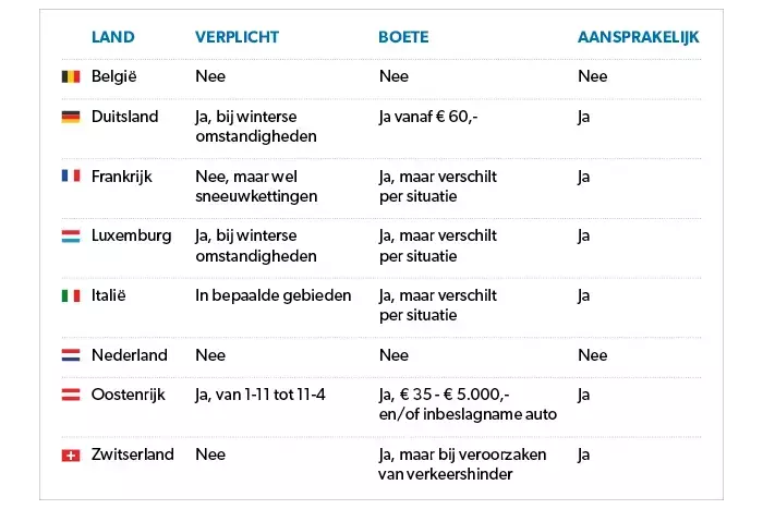 Steeds meer landen hebben verkeersregels over het gebruik van winterbanden en sneeuwkettingen. Omdat dit verschilt per land, vindt u hiernaast een overzicht van landen waar winterbanden en/of sneeuwkettingen verplicht zijn.