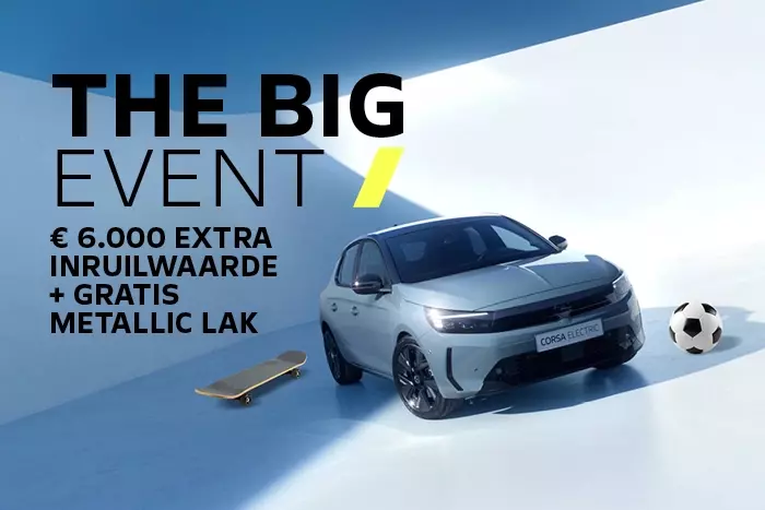 The Big Event van Opel is terug. Het jaarlijkse Opel-event waar iedereen naar uitkijkt. Want tijdens The Big Event telt alles wat rolt of rijdt mee voor extra inruilwaarde, van je huidige auto tot een golfballetje. En dat maakt dit hét moment om over te stappen, want alleen nu ontvang je tot maar liefst € 6.000 extra inruilwaarde bovenop de waarde van je huidige auto.