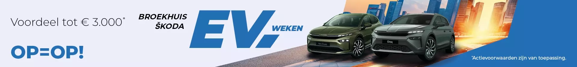 Ervaar de volledig elektrische vloot van Škoda met de Škoda EV Weken. Tot 31 januari profiteer je van zeer aantrekkelijke prijzen op diverse elektrische Škoda-modellen. Dankzij de bijtelling van 17% rijd je elektrisch op een bijzonder voordelige manier. Alle modellen zijn direct beschikbaar uit onze voorraad. Of je nu kiest voor compact, ruim of extra luxe, er is altijd een elektrische Škoda die past bij jouw wensen.