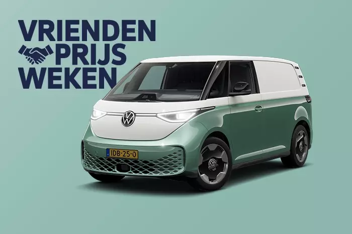Je rijdt de ID. Buzz Cargo nu extra voordelig tijdens de Vriendenprijs Weken van Volkswagen Bedrijfswagens! Profiteer tijdelijk tot € 9.000 voordeel op de ID. Buzz Cargo of een extra scherp Financial Lease tarief vanaf € 349 p/m
